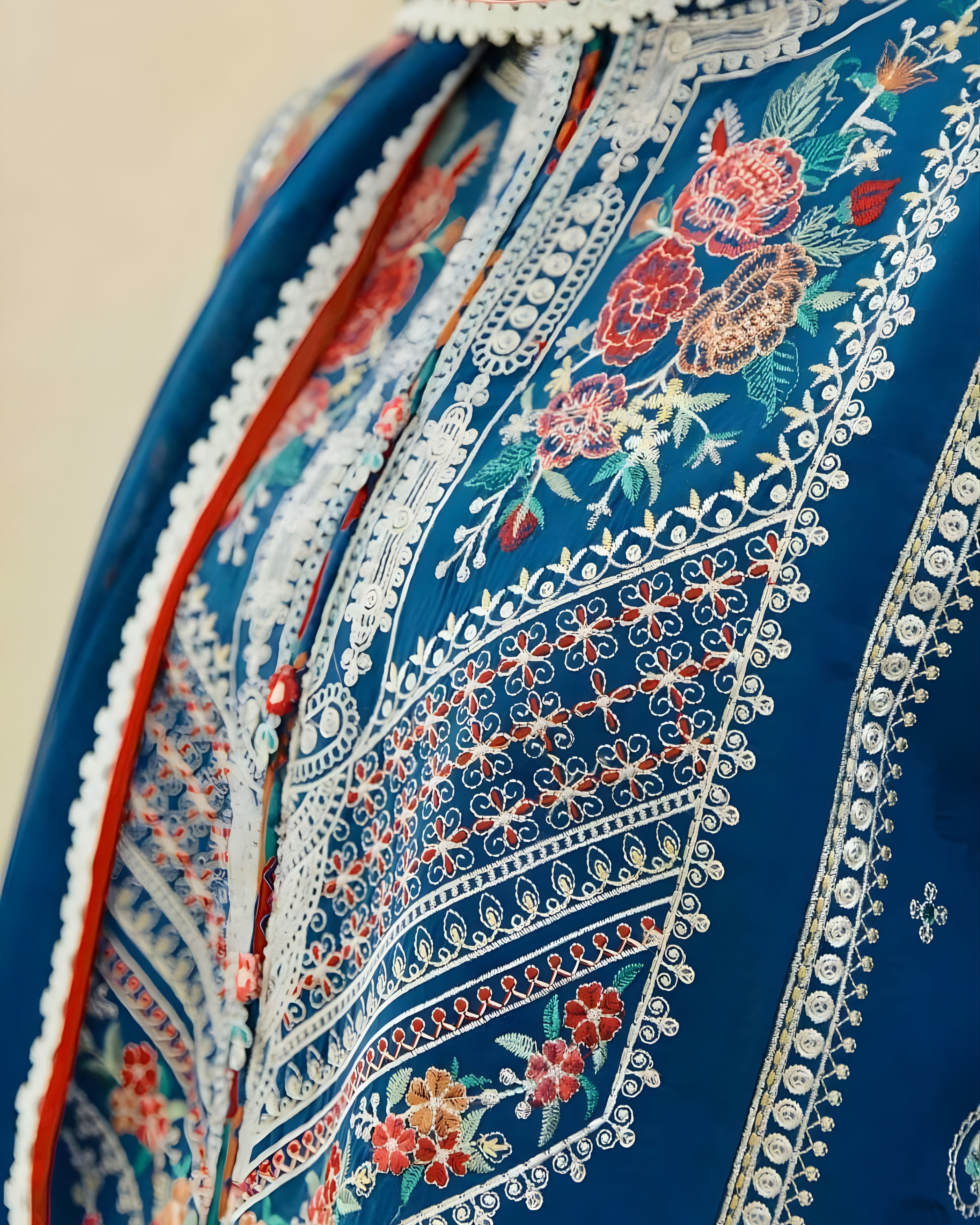 Product Name: 3 Pcs Women's Unstitched Embroidered Suit Product Description: Product Details:Shirt Fabric: Dhanak Pattern: Embroidered Shirt Front Pattern: Embroidered Sleeves Pattern: Embroidered Trouser Fabric: Dhanak Trouser Pattern: Embroidered Dupatta Fabric: Wool Dupatta Pattern: Digital Print Number Of Pieces: 3 Pcs Package Includes: 1 x Shirt, 1 x Trouser, 1 x Wool Shawl Shirt Cutting: 3 Gazz Trouser Cutting: 2.5 Gazz Dupatta Cutting: 2.5 Gazz Color: Blue Note: There might be an error of 1-3 cm due to manual measurement, and slight color differences may occur as a result of varying lighting and monitor effects.